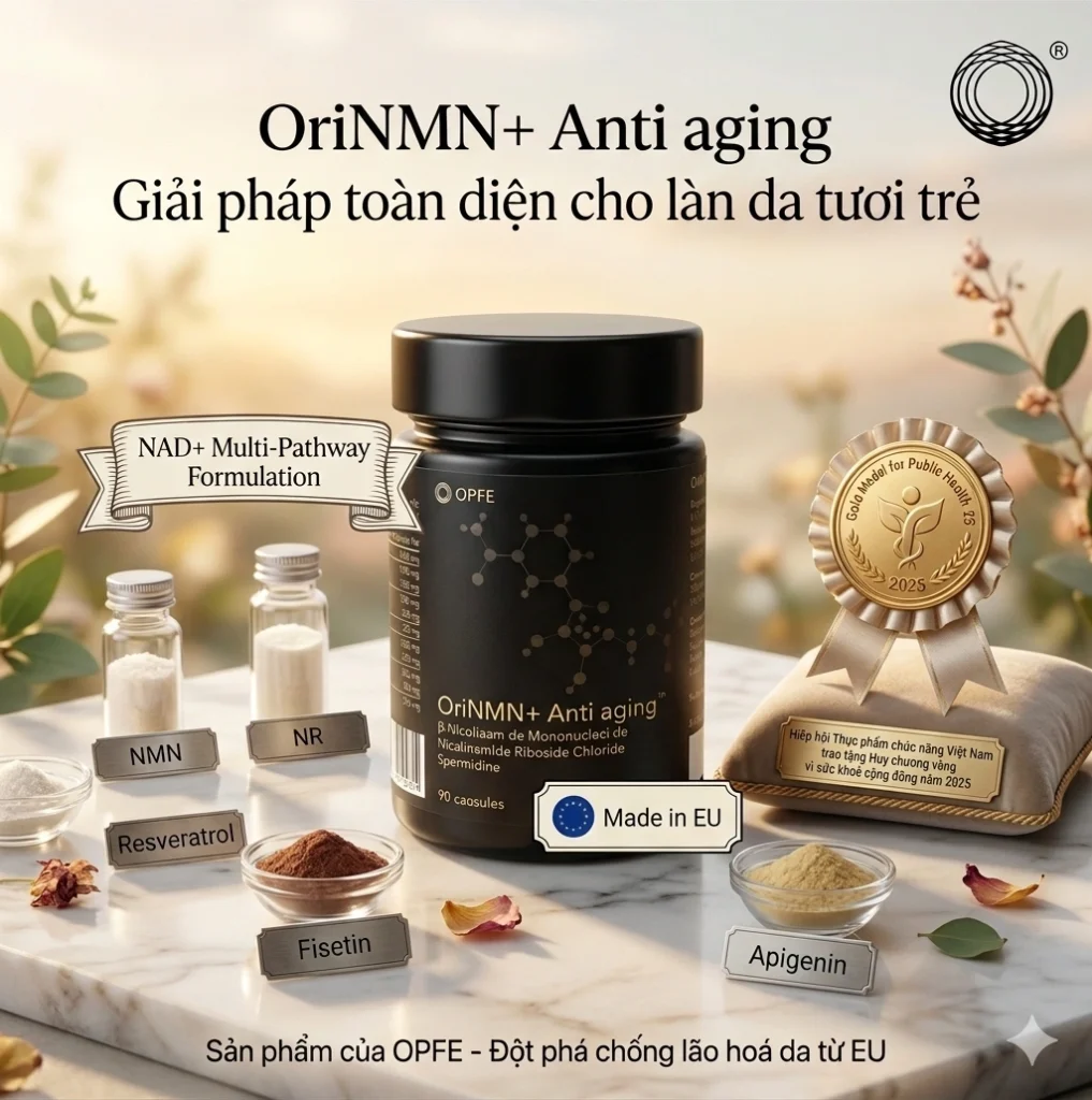 Thực phẩm bảo vệ sức khỏe OPFE OriNMN+ Anti aging là sản phẩm được sản xuất tại Hungary (Made in EU), phối hợp các tiền chất NAD⁺ như NMN và NR cùng với các hợp chất sinh học nhóm polyphenol (resveratrol, fisetin, apigenin). Sản phẩm được phát triển nhằm hỗ trợ cải thiện tình trạng lão hoá da. Sản phẩm đã vinh dự nhận giải thưởng “Huy chương vàng vì sức khỏe cộng đồng năm 2025” do Hiệp hội Thực phẩm chức năng Việt Nam trao tặng ngày 13/01/2025.
